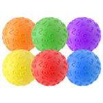 Colourful, low-pressure, rubber playballs with soft textured surface.